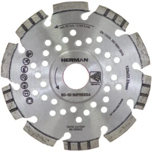 HERMAN BD-50 Impressa patrí medzi profesionálne diamantové kotúče, preto poskytuje agresívny a zároveň stabilný rez aj pri tvrdých materiáloch. Zároveň kombinuje moderné segmenty a pevné jadro, čím zabezpečuje spoľahlivý výkon v súlade s normovým rámcom STN/EN.