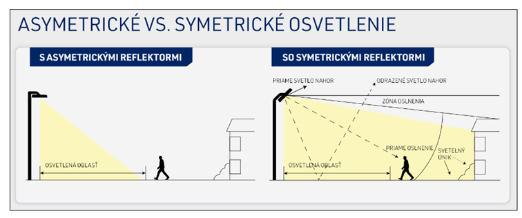 Popis obrázka: Porovnanie asymetrického a symetrického osvetlenia ukazuje rozdiel v rozložení svetelného toku na osvetľovanej ploche. Asymetrické reflektory smerujú svetlo priamo na cieľovú oblasť, preto minimalizujú oslnenie a svetelný únik. Naopak symetrické reflektory rozptyľujú svetlo aj mimo požadovanej zóny, čo zvyšuje oslnenie, znižuje efektivitu osvetlenia a môže spôsobovať svetelné znečistenie.